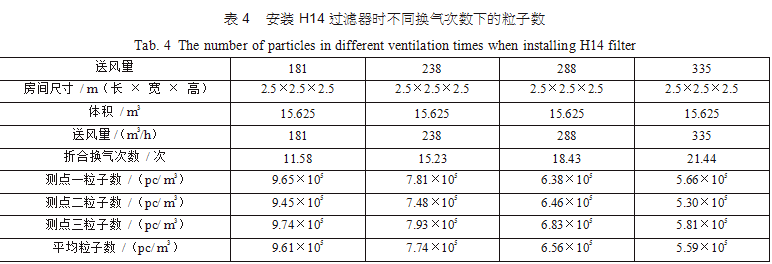 在空調機房中新建了三間2.5m×2.5m×2.5m的潔凈間,從空調主風管引風,每支支管設置調節(jié) 閥,并設排風機進行全排,送回風口及測點布置分別如圖 3(每點取樣三次,取平均值)??紤]到初中效過濾器對最后潔凈度的影響和最后理論塵埃數(shù)量 計算的方便,試驗用初中效繼續(xù)分別為G4、F8,三個房間分別安裝高效過濾器,風量500m3/h,第一組數(shù)據(jù)為送風量按GMP 驗證指南推薦換氣次數(shù)保持不變,分別用H12、H13、H14、U15過濾器,第二組數(shù)據(jù)為采用H13高效過濾器,調節(jié)風量 ;第三組數(shù)據(jù)為采用H14高效過濾器,調節(jié)風量,分別測得塵埃粒子數(shù),并列表得出不同的換氣次數(shù)下對應的塵埃數(shù)如表2、表3、表4。